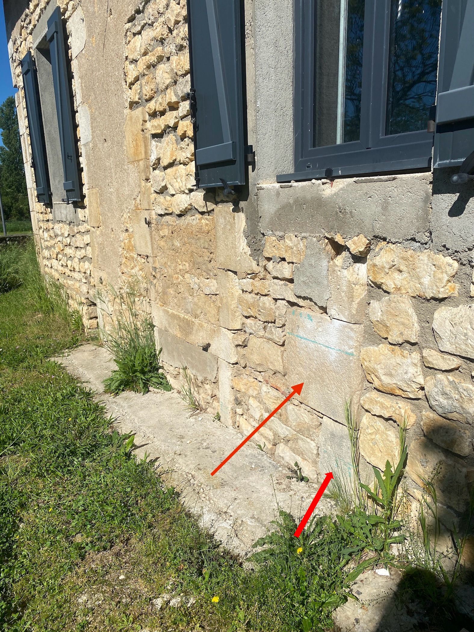 - Commentaires : Marquage à la peinture, daté du 6 janvier 1994, situé à environ 71 cm du sol et inscrit sur la façade en pierre de l’habitation.