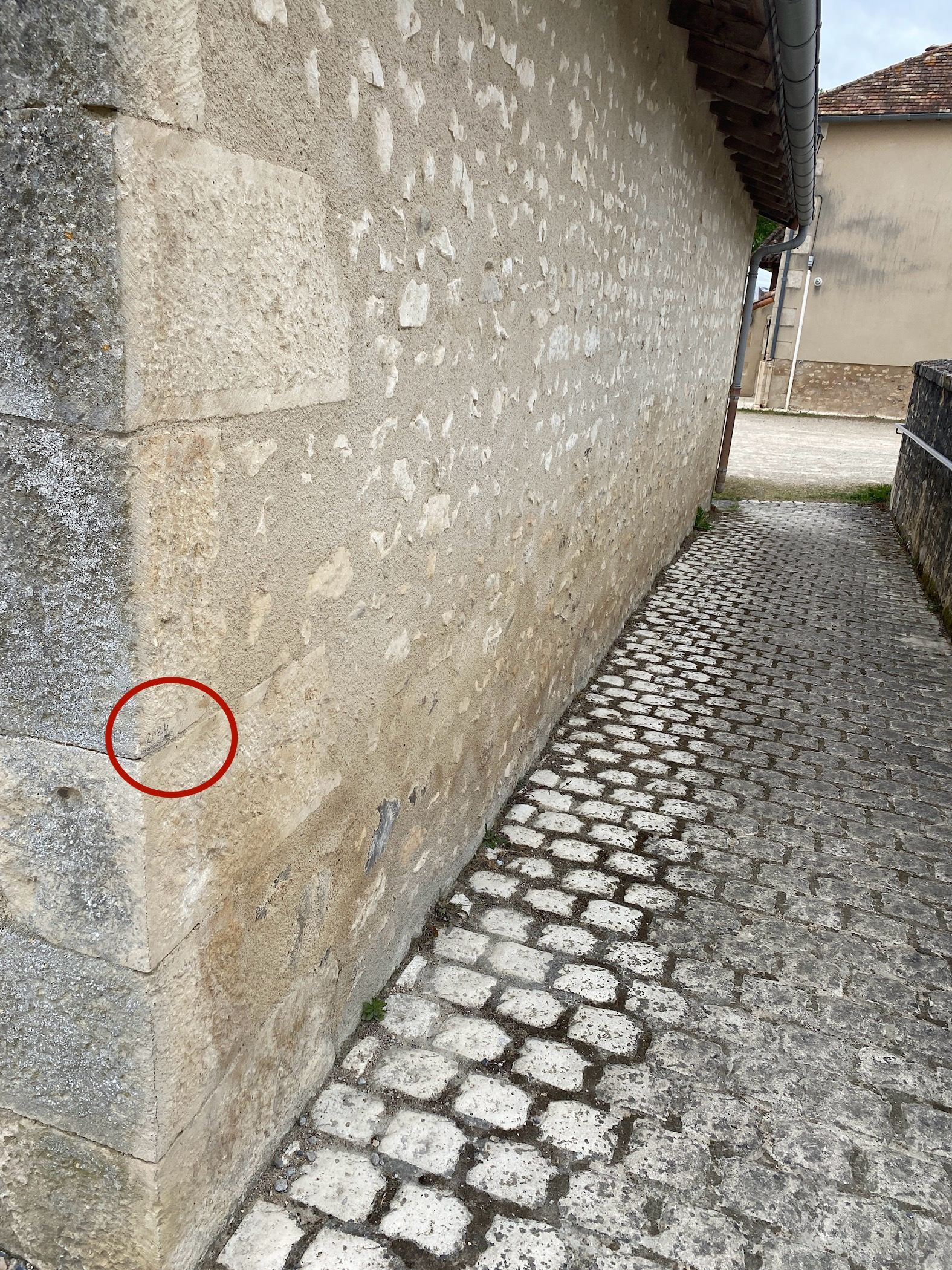 - Commentaires : Marque au crayon datée de 2024 sur le mur de la grange du restaurant la Bisquine à environ 88 cm du sol. Elle est associée au débordement du Goberté en mars 2024.