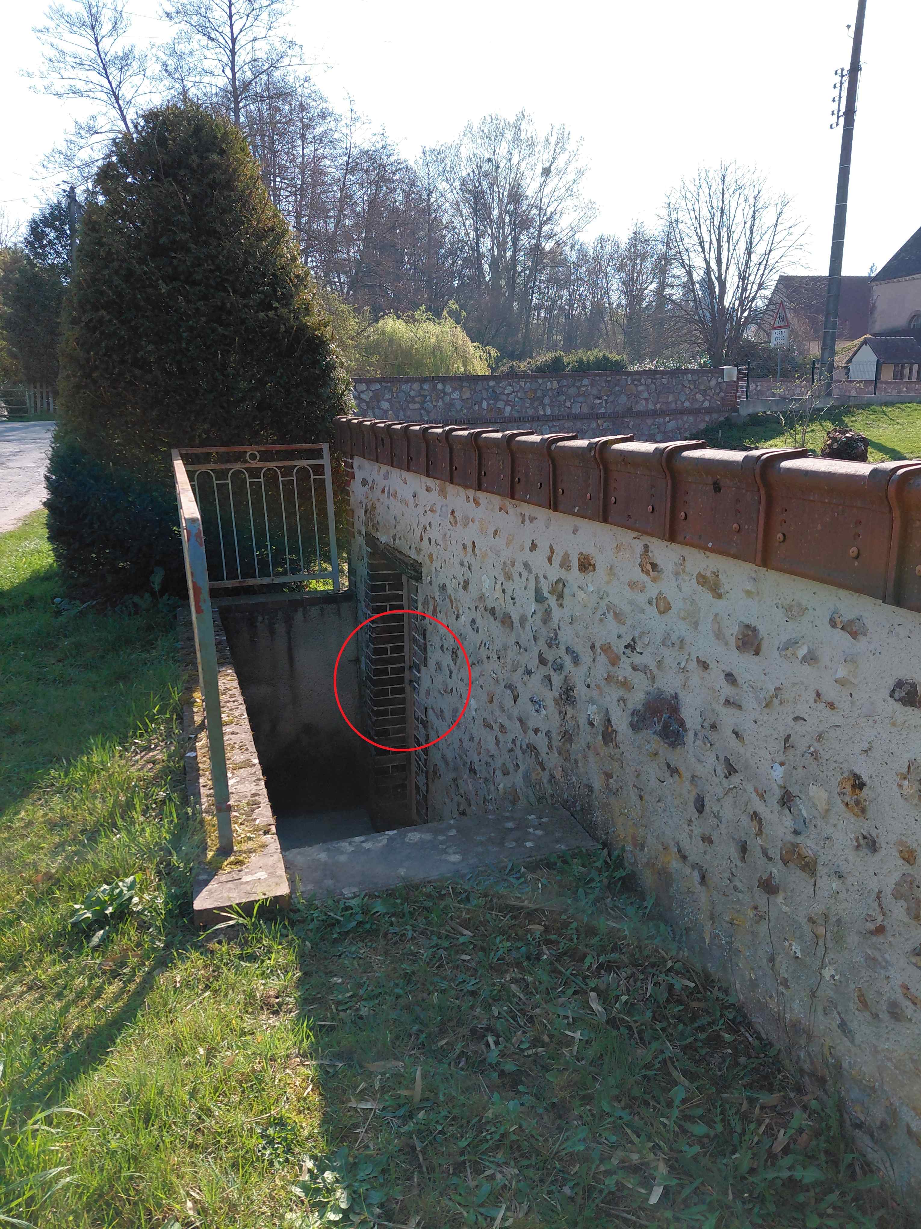 - Commentaires : Mur du lavoir rive droite à proximité de la grille d’accès de la porte d'entrée, en bas des marches, en aval du pont, Chemin des Aulnes..